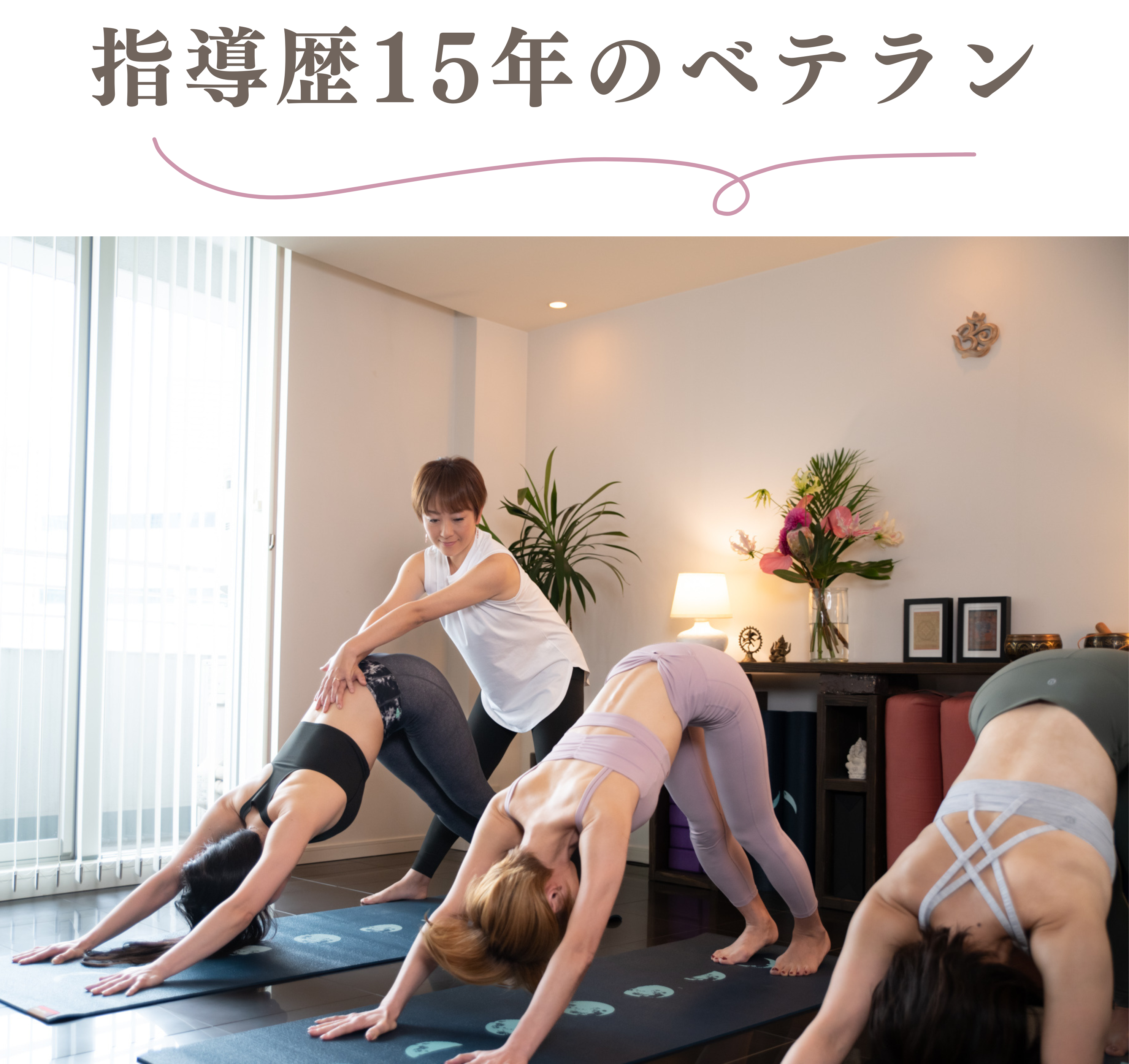 長年ヨガと共に研究してきた「解剖学」や「整体理論」と言うエビデンスに基づいた、体の不調改善に効果的な指導には定評があり、45歳以降の更年期世代の女性、また閉経後の女性の不調改善目的でのヨガに特化した指導を行っています。